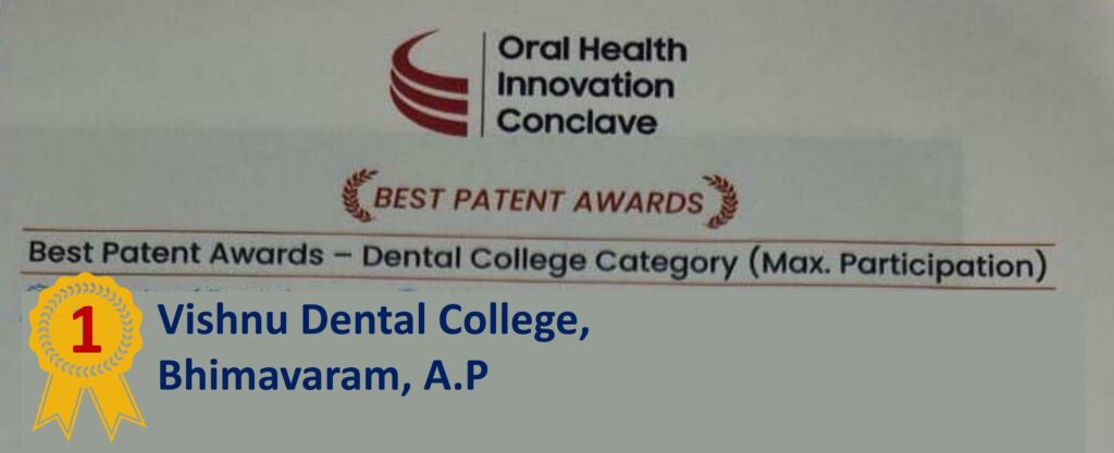 Vishnu Dental College conferred First Place in the Best Patent-Dental College Category ( Max. Participation) at the Innovation Exhibit of Oral Health Innovation Conclave 2023, at Manekshaw Centre, New Delhi.